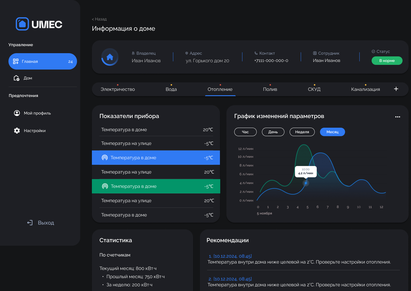 - Мониторинг всех инженерных систем в режиме онлайн. На оборудовании здания устанавливаются датчики: температура и влажность в помещениях, давление в трубах, ток и напряжение на линиях питания, состояния лифтов, сигнализация и т.п. Все эти показатели собираются и отображаются на едином дашборде для оператора или диспетчера здания. Специалист в любой момент видит, где температура вышла за норму, какой насос отключился, есть ли сбой в системе вентиляции и т.д. Причем доступ возможен удаленно – например, инженер управляющей компании может проверить состояние котельной через интернет, не выезжая на объект.